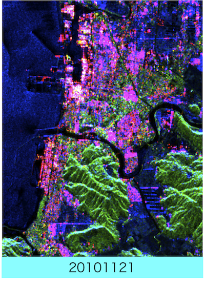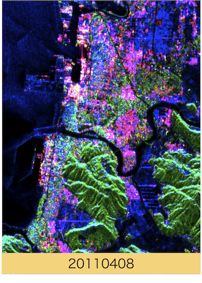 青: 表面散乱(津波によるさら地,裸地,畑),緑:体積散乱(主に植生),赤:2回反射(主に建造物),白(散乱体の密集地)