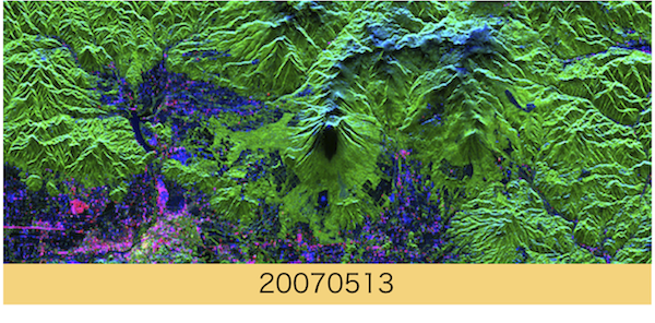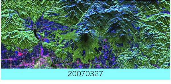 青: 表面散乱(主に雪),緑:体積散乱(主に植生),赤:2回反射(主に建造物)