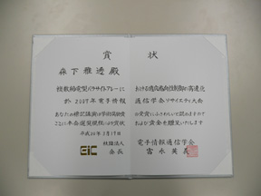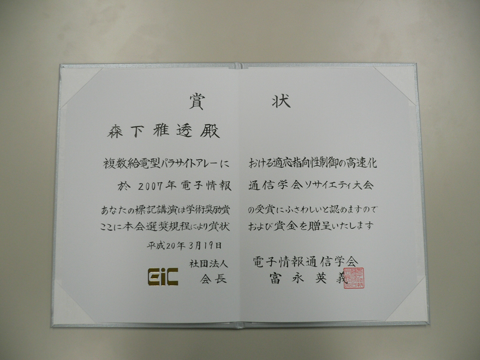 森下君が電子情報通信学会 平成19年度学術奨励賞を受賞しました.